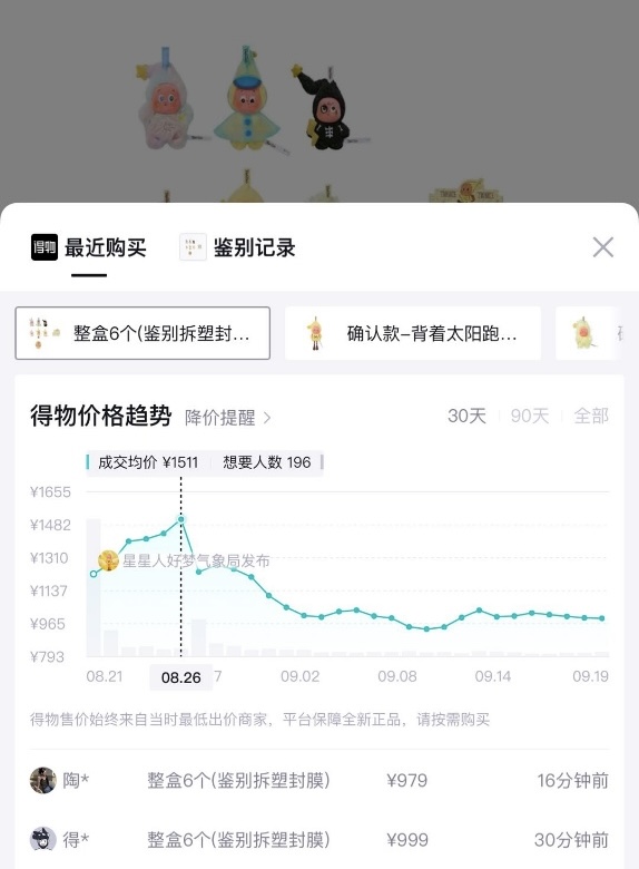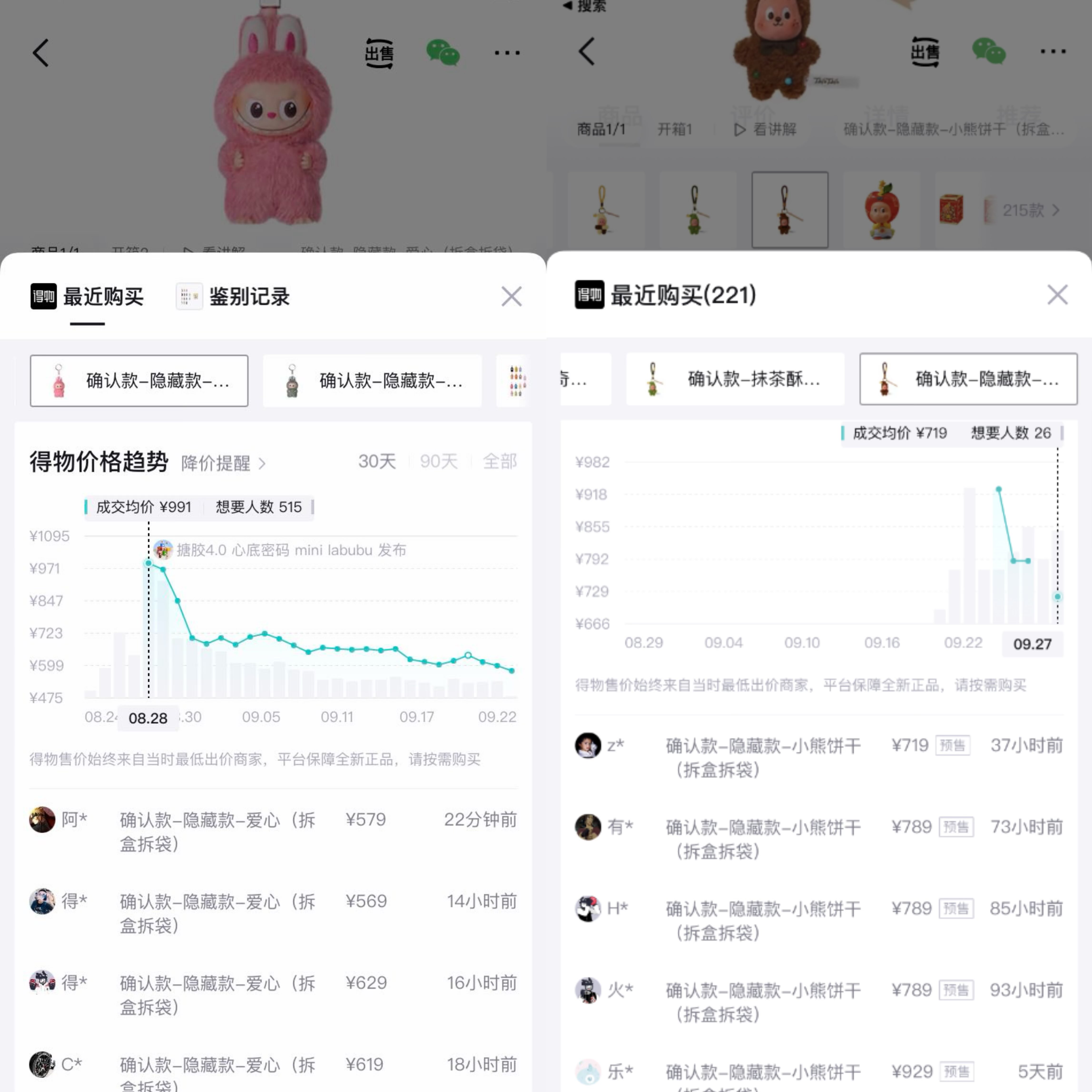 然而该情况在发售后出现了下滑,发售当日23时,记者在得物App上看到,毛绒端盒成交记录一直反复在600元左右上下波动,从数据曲线来看,端盒从9月22日的1070元持续走低跌至709元,其中隐藏款价格也从929元跌至717元,而真实成交记录在500-800元之间。
